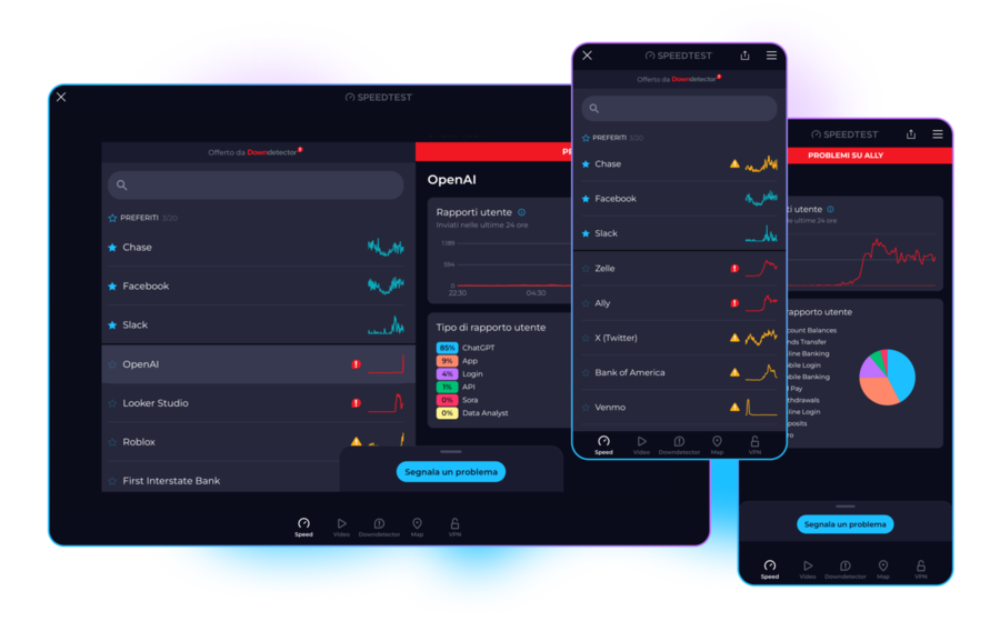 Monitora e segnala in tempo reale i problemi relativi ai tuoi servizi preferiti utilizzando Downdetector, la piattaforma più diffusa al mondo per il monitoraggio di interruzioni e problemi di connettività.